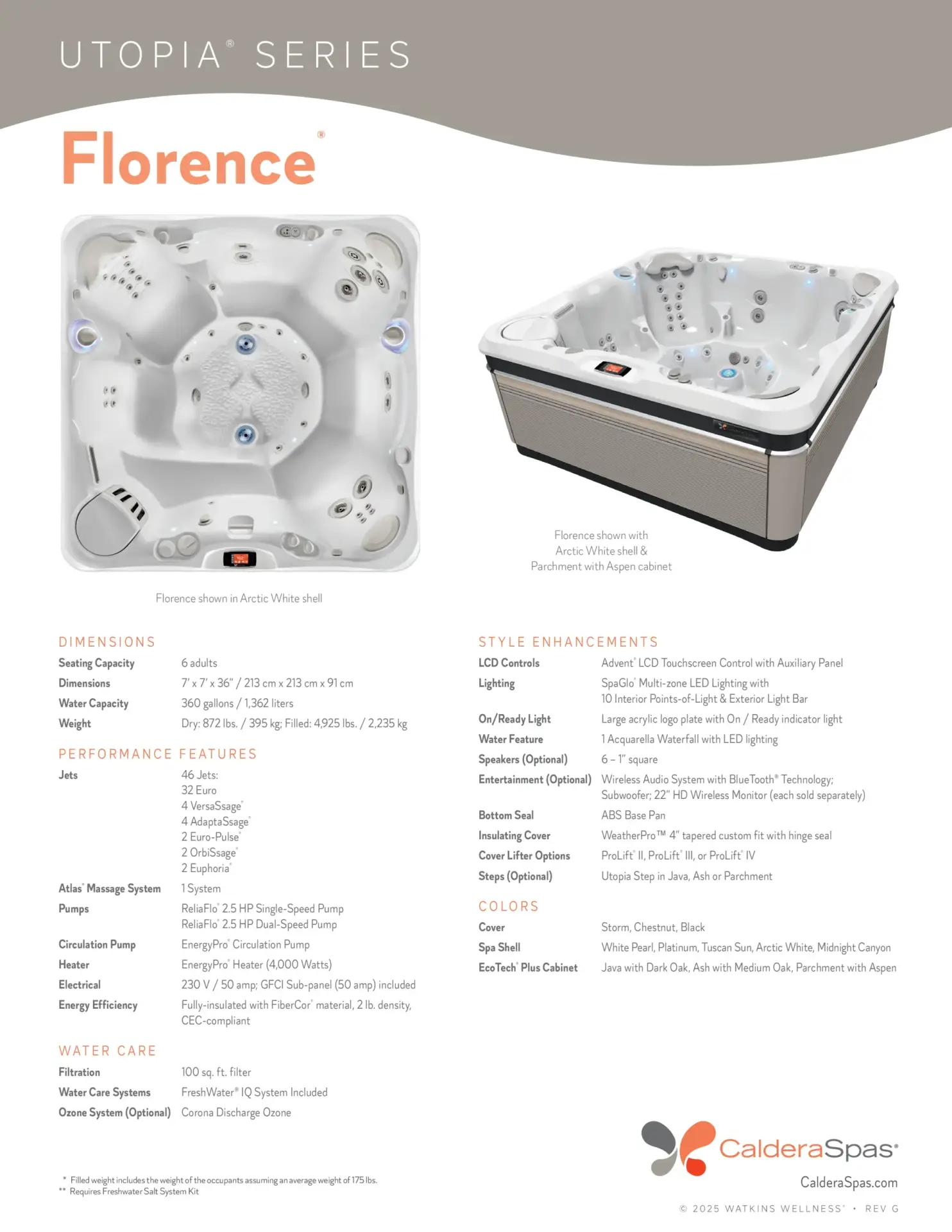 The Florence features more targeted massage seats than any other Caldera spa. As you move from seat to seat in the Florence you’ll experience a full body massage, with jets that focus on your neck, shoulders, upper back, mid back, lower back, hips, thighs, calves, feet and wrists.