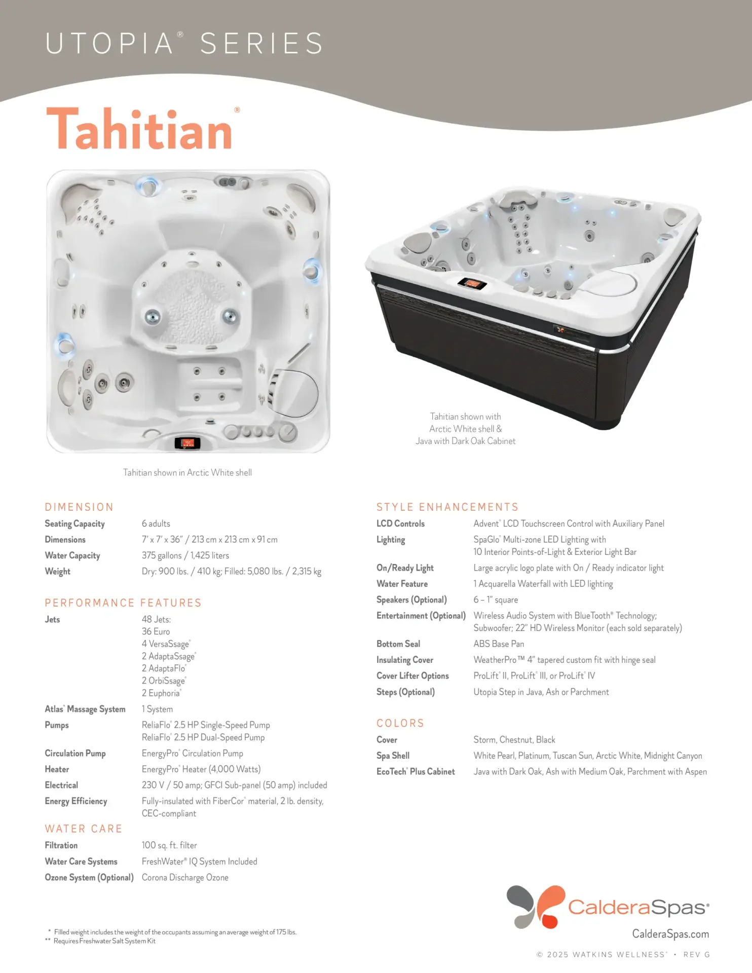 The Tahitian features more targeted massage seats than any other Caldera spa. As you move from seat to seat in the Tahitian, you’ll experience a full body massage, with jets that focus on your neck, shoulders, upper back, mid back, lower back, hips, thighs, calves, feet and wrists.
